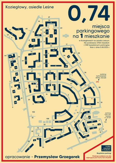 Ostatnio przeprowadził analizę z której wynika, że na 1 mieszkanie w Koziegłowach przypada 0,74 miejsca parkingowego.