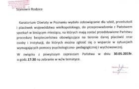 Kuratorium Oświaty w Poznaniu wydało zobowiązanie do przeprowadzenia z rodzicami placówek oświatowych spotkań w bieżącym miesiącu, na których mają zapoznać się z istniejącymi procedurami bezpieczeństwa …