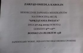 Zarząd osiedla Karolin zaprasza wszystkich mieszkańców do udziału w corocznej akcji „Sprzątania świata” w dniu 27.04 w godzinach od 9:00 do 12:00. Worki, rękawiczki i …