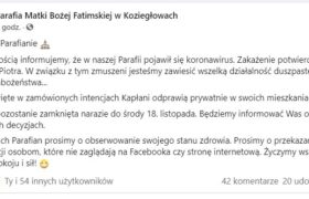 więcejNa profilu FB Parafia Matki Bożej Fatimskiej w Koziegłowach pojawiła się informacja o konieczności odwołania do 18 listopada wszystkich najbliższych mszy świętych i nabożeństw. Przyczyną …