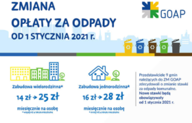 „Informujemy, że decyzją Związku Międzygminnego GOAP od stycznia 2021 roku zmianie ulegną stawki opłaty za gospodarowanie odpadami komunalnymi dla nieruchomości zamieszkałych. Mieszkańcy Spółdzielni jako zabudowa …