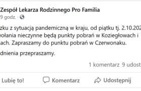 Profamilia na swoich stronach poinformowała, że w związku z sytuacją pandemiczną zamyka punkt pobrań krwi w Koziegłowach. Otwarty będzie tylko ten w Czerwonaku. …