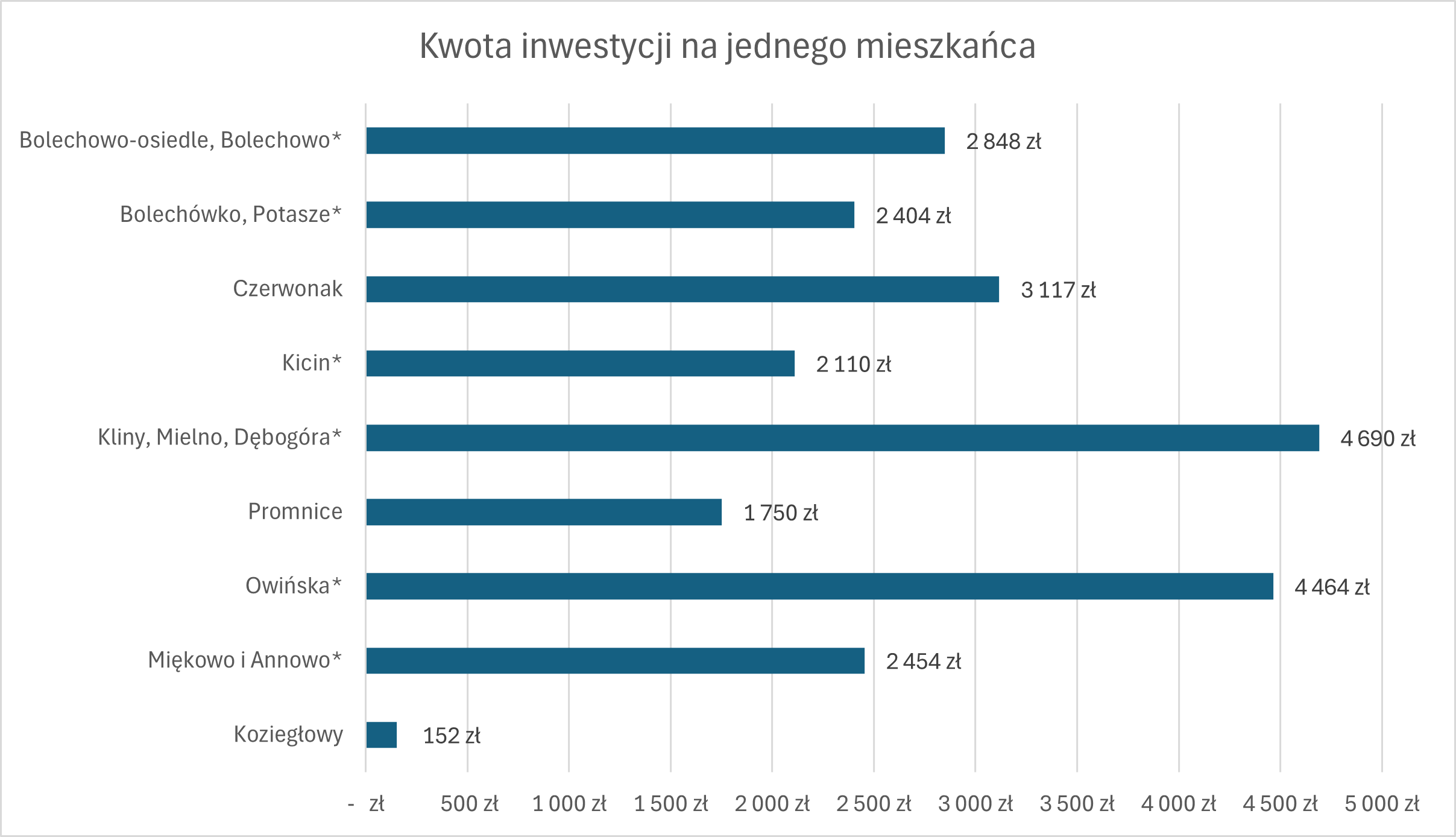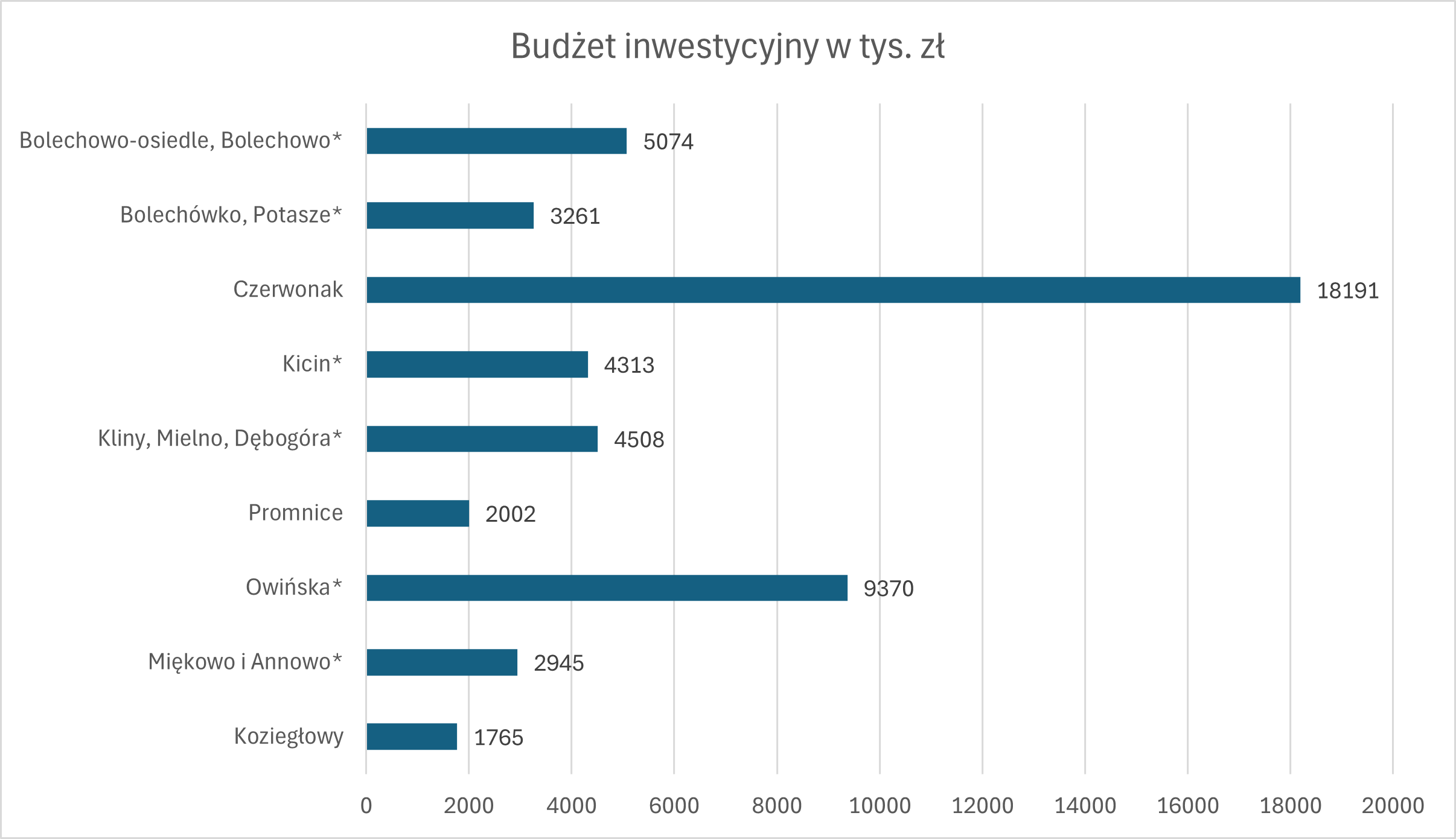 Wójt Gminy Czerwonak, Marcin Wojtkowiak na swoim profilu na FB opublikował informacje o inwestycjach jakie zaplanowane zostały do realizacji w roku 2026 w poszczególnych obszarach Gminy. Poniżej przedstawiamy wykresy jak te wygląda to kwotowo. Wykres są bardzo ogólne, gdyż wójt bardzo nieszczegółowo przedstawił konkretne kwoty. Jedną inwestycję w postaci wydatku ok 14 milionów wskazał aż w 6 lokalizacjach. Dlatego np. tą kwotę podzieliliśmy na 6 i proporcjonalnie dodaliśmy 1/6 kwoty tej inwestycji do każdego wspomnianego obszaru i dodaliśmy przy ich nazwach gwiazdkę (*). Jakkolwiek jednak to policzymy i tak Koziegłowy w przeliczeniu na mieszkańca dostaną najmniej. Inwestycje w 2026 roku w Koziegłowach wyniosą uwaga …… całe ok. 150 zł na mieszkańca. I tak mało w nasz obszar inwestuje już od wielu lat. A obiecywał nam 7 lat temu nową szkołę podstawową 🙁